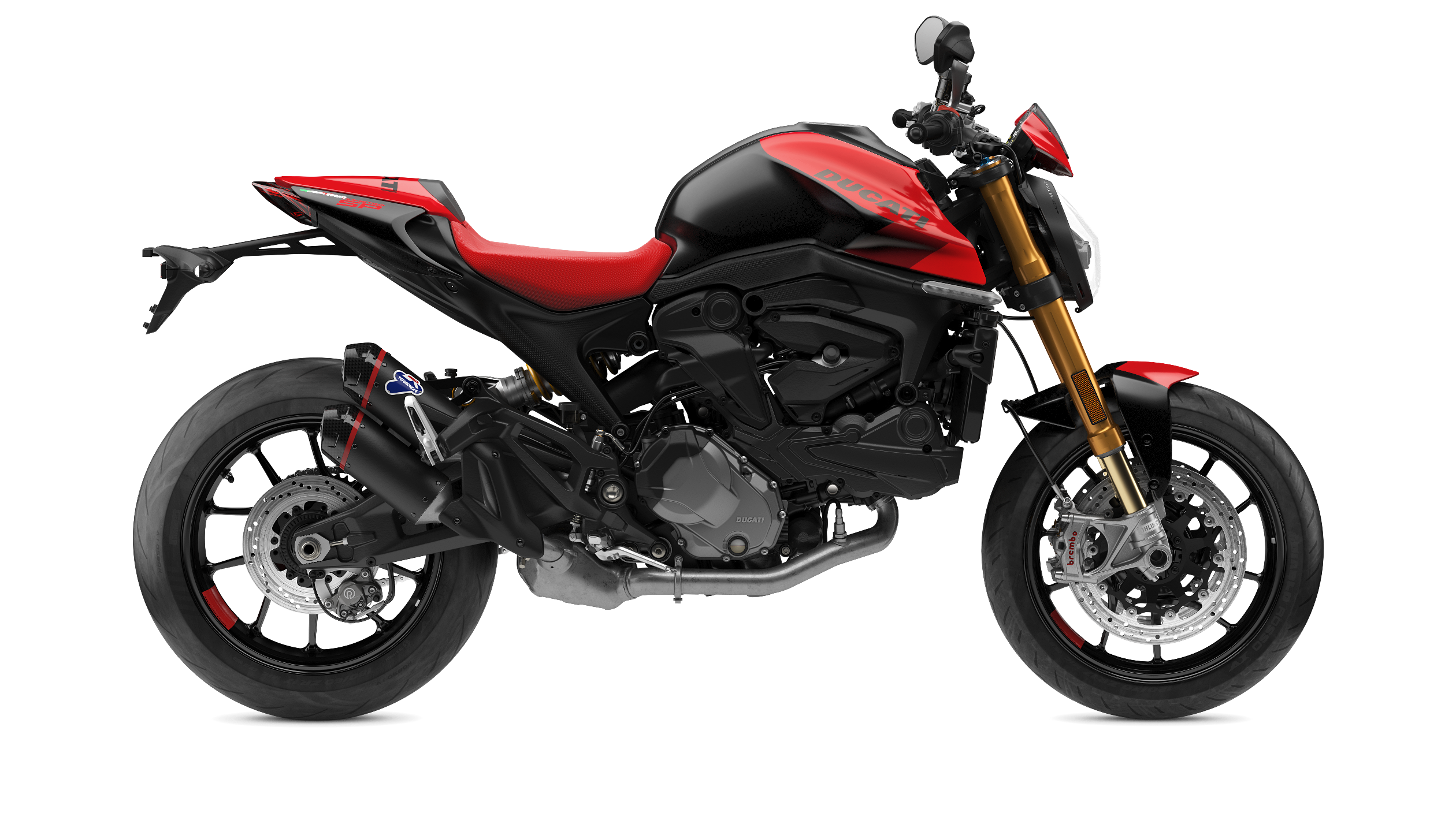 金色的 Öhlins NIX30 欧林斯前叉增强了新 Monster SP 的运动型外观。摩托车采用了 Termignoni 特米排气和 Brembo Stylema® 前卡钳,能够使其更轻,更有效,在运动性骑行中更有乐趣,也更有美感。